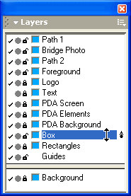 When you imported the PNG, several new layers were created and highlighted in the Layers panel: Path 1, Bridge Photo, Box, and Path 2. These layers were defined by the Fireworks PNG. They were imported here with their names intact because you selected the Remember Layers option in the Fireworks PNG Import Settings dialog box.