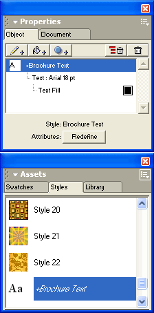 Clicking Redefine causes all text blocks in the document that possess the Brochure Text style to change to reflect the style modification. In the Styles panel and the Object panel Properties list, the style name also no longer has a plus sign beside it. |