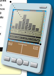 Because the clipping path's gradient mask effect and fill properties precede the SWF movie in the Properties list, the SWF movie's appearance is altered. It now appears as though it's behind the reflective PDA screen.