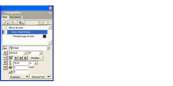 Au bas du panneau Objet, vous trouverez le menu contextuel Effets de texte. Leffet Graphique (Windows) ou leffet Elément graphique (Macintosh) est sélectionné. Cette option est activée chaque fois que vous mettez en surbrillance un graphique contouré dans un bloc de texte. Les graphiques contourés sont traités comme des caractères de texte dans FreeHand.