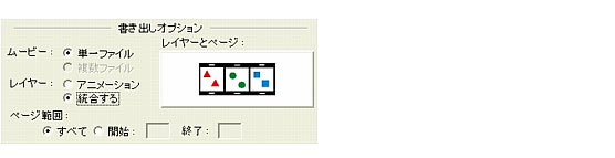 [書き出し] オプションで、[レイヤー] の [統合する] オプションを選択します。このオプションを選択すると、ページごとにすべての FreeHand レイヤーが単一のムービーフレームに変換されます。![]() |