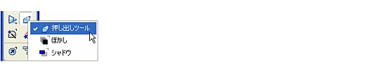 押し出しツールが表示されていない場合は、代わりにそのポップアップメニューの別のツールが表示されていることがあります。この場合は、ぼかしツールまたはシャドウツール (どちらか表示されている方) をクリックしてマウスボタンを離さないでおくと、ツールポップアップメニューが表示されます。次に、押し出しツールを選択します。ポップアップメニューがあるツールには、右下隅に小さな矢印が表示されます。![]() |