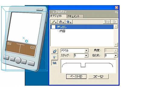 押し出しは、FreeHand の大変便利な機能です。押し出しを使うことで、2D のオブジェクトに簡単に 3D の外観を与えることができます。ここでは、PDA のグラフィックを押し出します。
