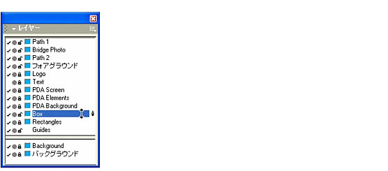 PNG を読み込むと、Path 1、Bridge Photo、Box、および Path 2 という新規レイヤーがハイライト表示されます。これらのレイヤーは、Fireworks PNG で定義されたものです。これらのレイヤーが名前が同じ状態のまま読み込まれたのは、[Fireworks PNG 読み込み設定] ダイアログボックスで、[レイヤーを保持する] を選択したためです。