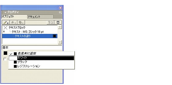 オブジェクトパネルの [プロパティ] リストで [テキストの塗り] プロパティを選択し、オブジェクトパネルの [色見本] ポップアップメニューから [ホワイト] を選択します。![]() |