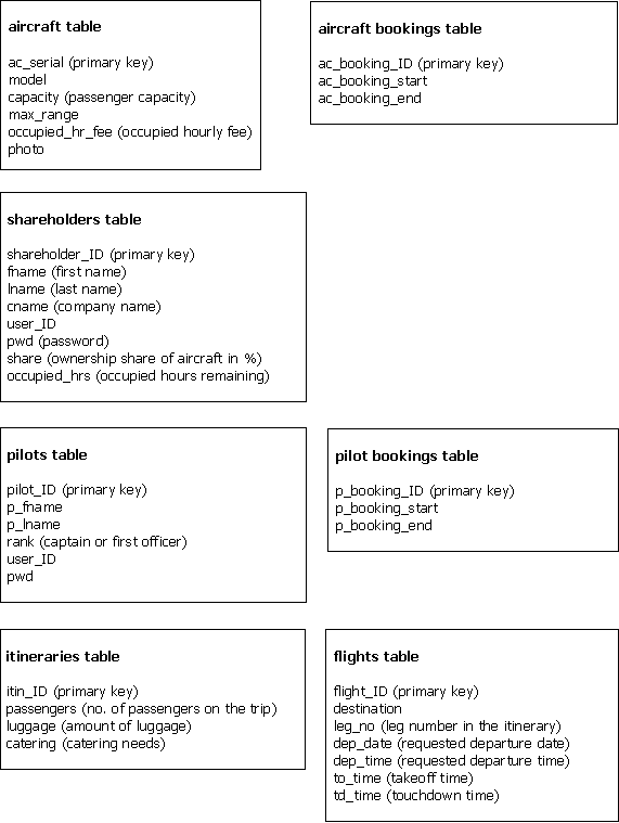 After some thought, you choose the following properties and primary keys for the tables in the Arrow Aircraft database: |