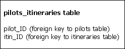 In addition, each pilot has many itineraries, and each itinerary has many pilots (at least one captain and a co-pilot). This is a "many-to-many" relationship and can be represented in the database by creating a special table consisting of two foreign keysin this case, pilot_ID and itin_ID :