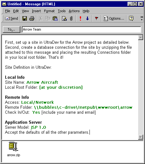 The e-mail instructs each team member to define a new site in UltraDev for the Arrow Aircraft project, and lists the settings. Then the e-mail tell users to copy the attached Connections folder into their site's local root folder. Copying the folder will create a connection called connArrow allowing the team member to connect to the database on the development server.