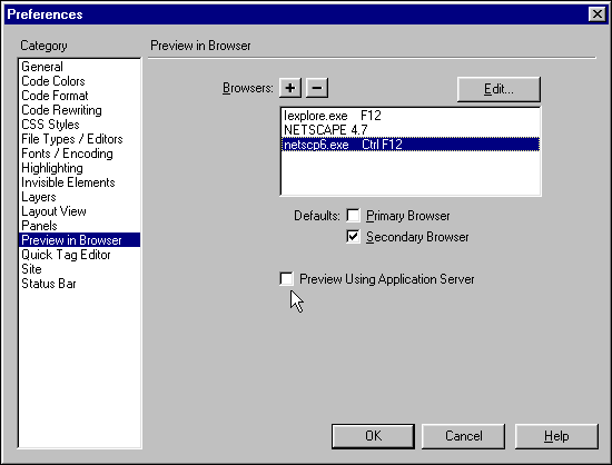 To tell UltraDev not to use the application server to preview static pages, choose Edit > Preferences, select Preview in Browser from the Category list, and make sure the Preview Using Application Server option is not selected, as follows: