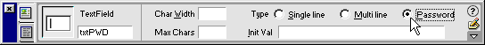 You conceal the password entered by the user by clicking the password field and selecting the Password option in the Property inspector (Window > Property inspector), as follows: