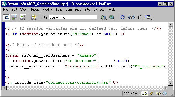 In the UltraDev Code view, you enter the following JSP scriptlet just before the existing code block that generates the recordset: