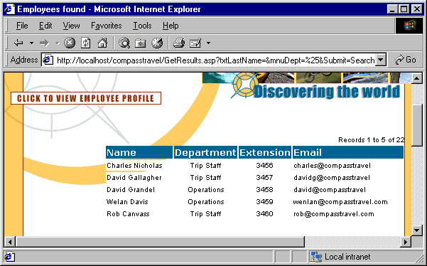 Next, you need to hide the table of results when no records are found. If the table doesn't have a repeat region, you can select the whole table and hide it. If the table has a repeat region, the row with the repeat region must be hidden independently from other rows in the table. In our example page, the first row is a heading row and the second row is a repeat region. Therefore, they must be selected and hidden independently as follows.