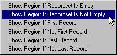 Next, apply a Show Region server behavior to the record counter. Select the record counter, open the Server Behavior panel (Window > Server Behaviors), click the plus (+) button, and choose Show Region > Show Region If Recordset Is Not Empty, as follows: