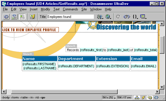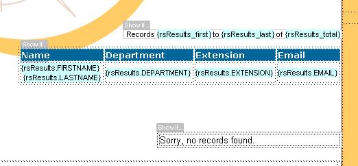 Faced with such a page, a user may wonder if there was an error or if the search feature is running at all. The solution is to apply a Show Region server behavior to a message alerting the user that no records were found. If records are found, the server behavior hides the message; if records are not found, the server behavior shows the message. This section describes how to create such a message.