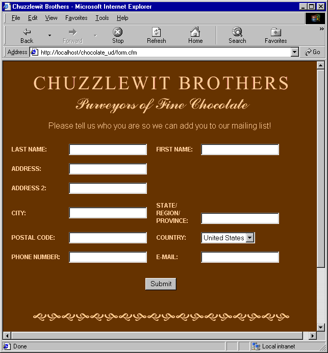 Here is a form on the website of a fictional American company, Chuzzlewit Brothers Chocolates.