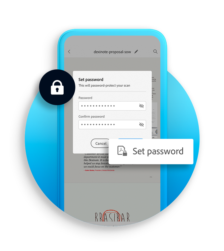 Adobe Scan, yalnızca bir tarayıcı uygulamasından çok daha fazlasıdır, dolayısıyla tarama işlemini güvenli şekilde gerçekleştirebilirsiniz. En önemli belgelerinizi parolayla koruyun. Düzenlemeler yapmak için taranmış PDF'leri farklı dosya türleri olarak dışa aktarın. Depolama alanı açmak için dosyaları sıkıştırın ve taramaları hızlıca başkalarına gönderin.