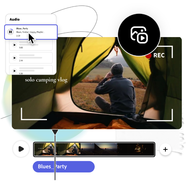 Our in-browser editor has all the video editing tools to add music to your videos. Adding sound to your video content is a great way to make your visual message pop. Search by mood or genre to get expertly curated, royalty-free song recommendations from Adobe Stock, or upload your own audio. Drop your audio track to different scenes in your timeline or play around with adding several songs to one video. The options are endless with Adobe Express.