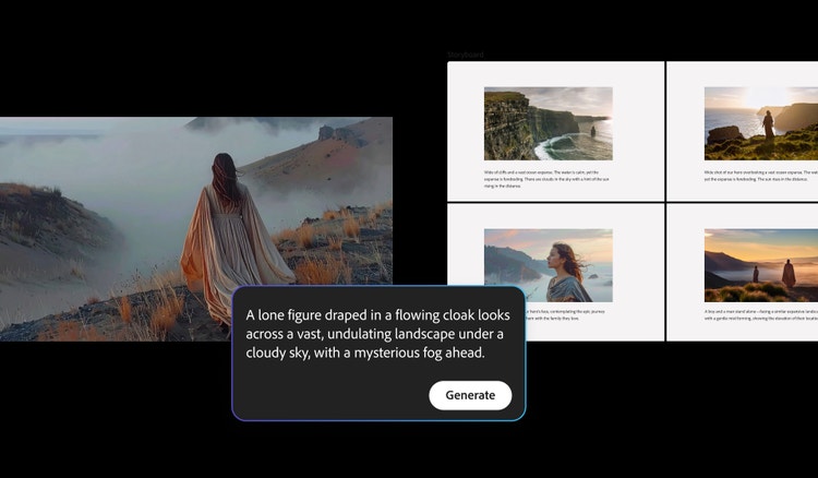 Firefly tarafından desteklenen yapay zeka destekli görsel taslak oluşturucuyu kullanarak ön prodüksiyon için sahneleri planlayın, karakterleri tasarlayın ve tutarlı çekim sekansları oluşturun. Hiç çizim deneyiminiz olmasa bile metinleri ve görüntüleri görsel çekimlere dönüştürün.