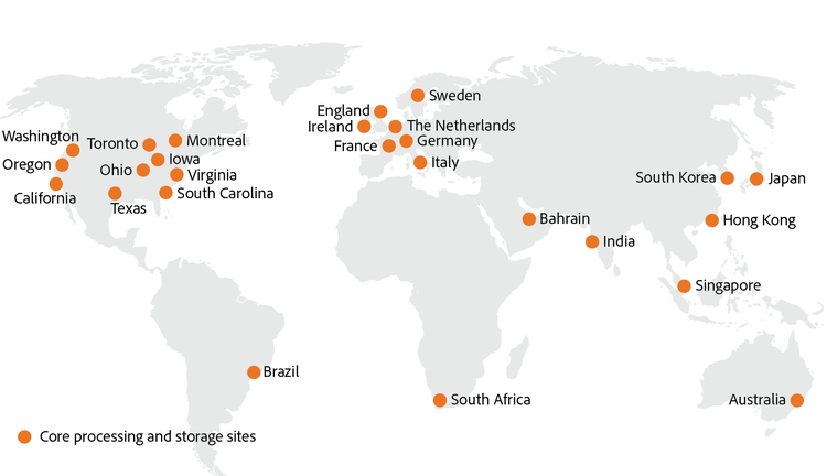 Most Adobe solutions are hosted in the data centers of leading cloud service providers in various locations worldwide, with the specific location/s provisioned upon contract signing. Some solutions are self-managed or offer a hybrid hosting solution. Please contact your Adobe representative for more information.