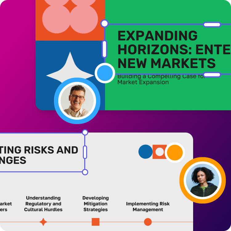 瀏覽我們的專業設計範本集並從中選擇,然後點選「下一步」。查看生成的大綱,並點選「生成」,Adobe Express 將在數分鐘內為您建立全新簡報。您可以上傳自己的影像與影片、更換配色方案、套用品牌元素,並根據需求進一步自訂。