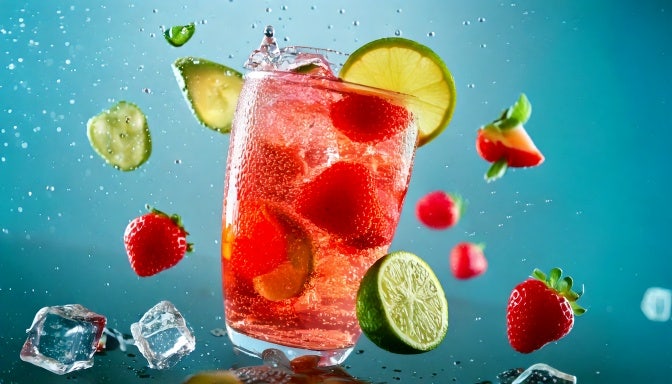 refreshing soda drink with strawberries and lime with copy space floating