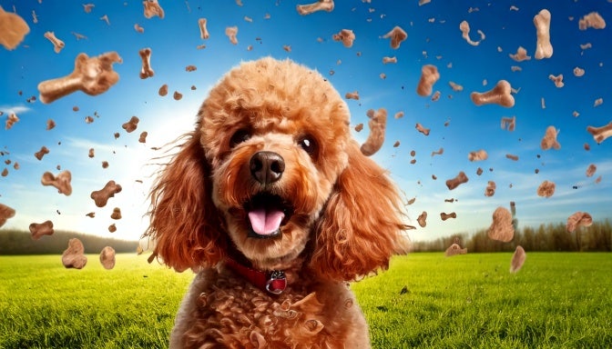 happy poodle dog causing chaos sending flying dog treats