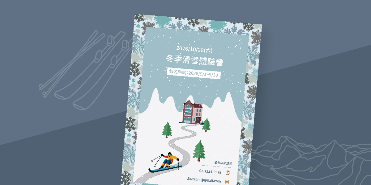 延伸聖誕賀卡單元完成的冬季插圖,以「以文字生成向量圖」生成不同類型的素材,並以生成式上色重新賦予配色,設計出一張滑雪體驗營宣傳海報。