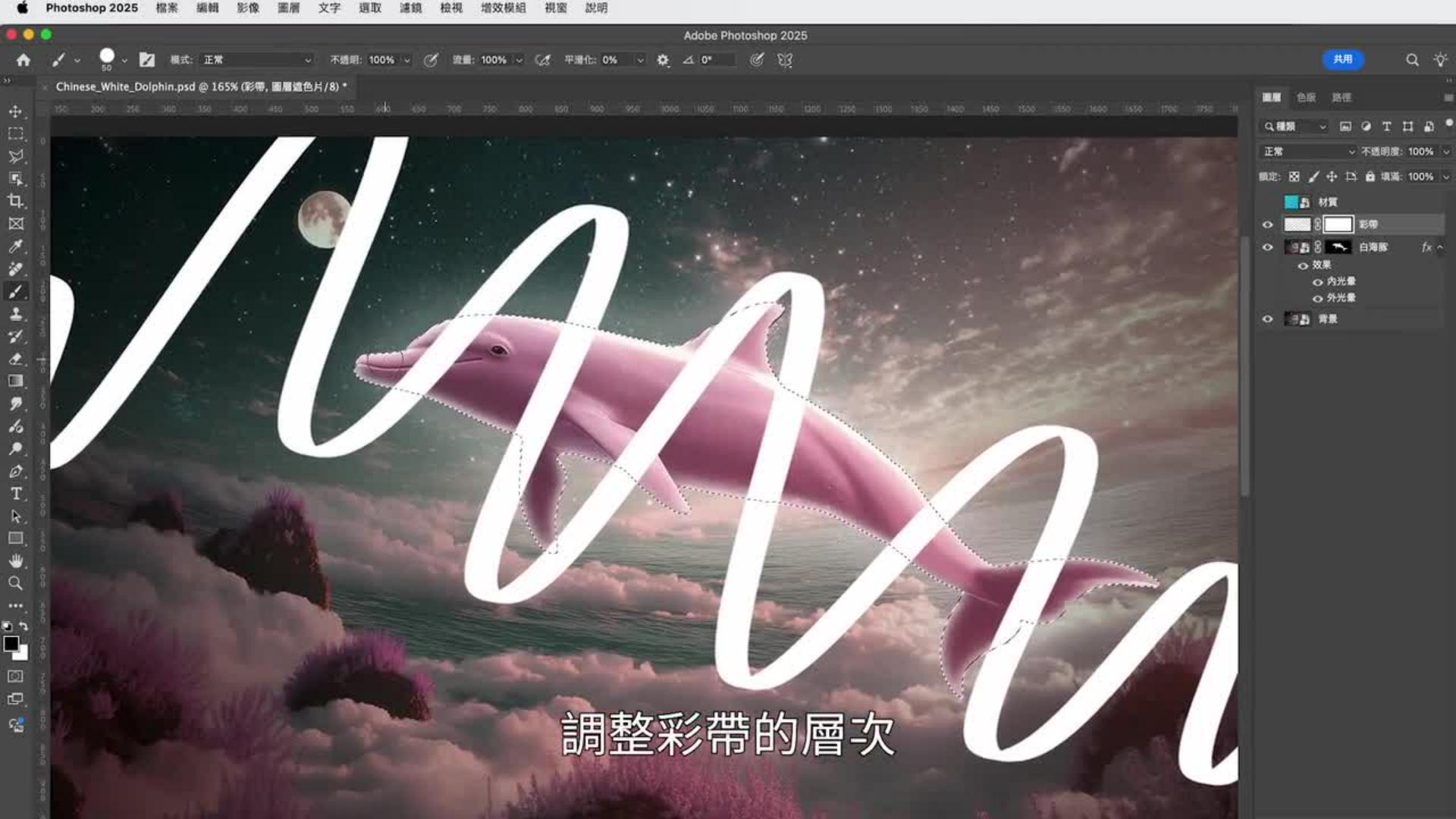 臺灣白海豚是瀕臨絕種的海洋珍寶,本課程將帶您運用Photoshop專業技法,重現白海豚躍出海面的靈動瞬間。從精準的路徑繪製到細膩的光影渲染,您將學會如何用繽紛彩帶環繞主體,創造出充滿生命力的動態插畫。