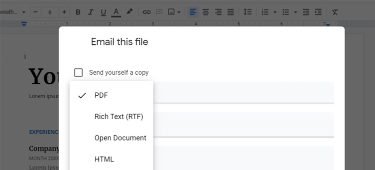 Email a PDF. For email, click File > Email, then choose Email This File. Select PDF from the drop-down at the bottom of the box.