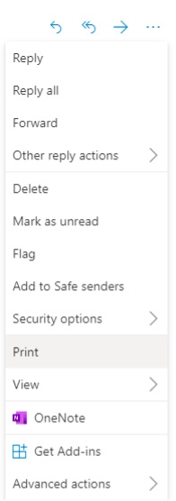 2. Open the email, press control + P on Windows or Mac and press command + P to be taken directly to the Print Menu (5). Alternatively, click the three dots in the top left corner if you’re in outlook on a web browser.