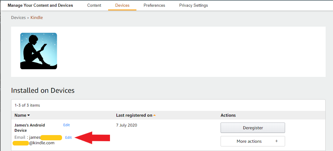 - Log in. Log into your Amazon account through Open Account & Lists and go to Manage your account and devices. On the top bar, find Devices and select your Kindle.