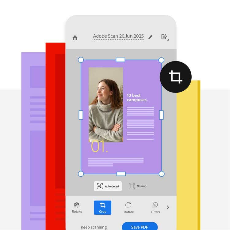 - Automatic recognition. Use the automatic recognition function of the Adobe Scan app to identify the document edges for an accurate and complete scan.