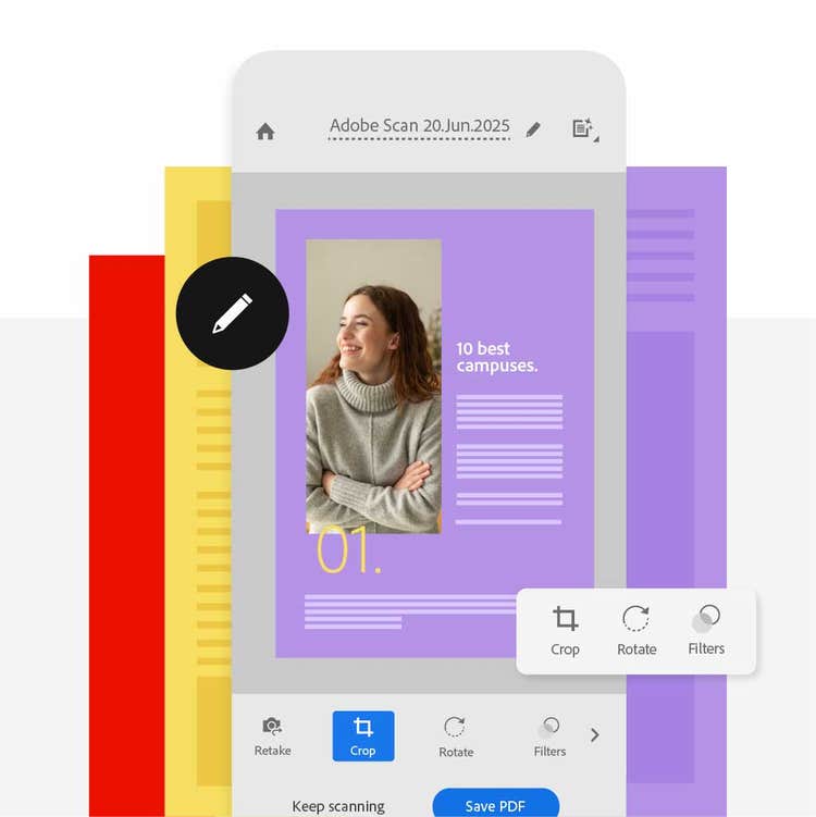 With the iPhone scanner from Adobe, it’s easy to edit your scan as soon as it’s finished directly in the app. You’ll also find tools to remove noise or marks on the paper, so you can easily clean your scanned documents.