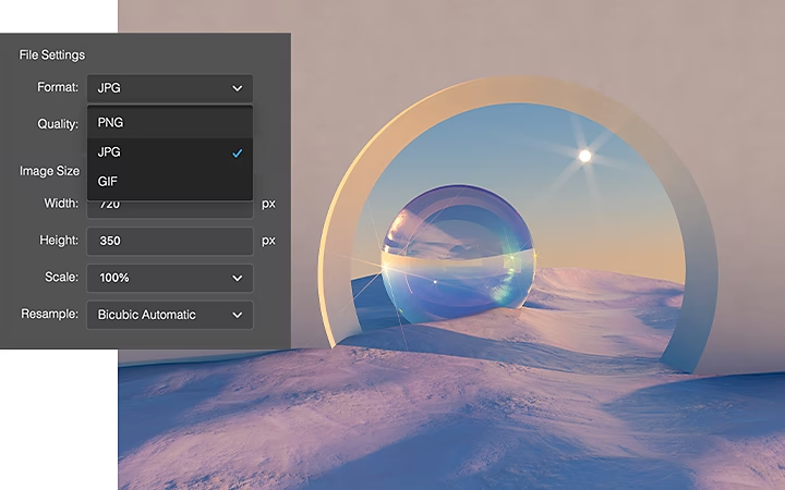 Export as vector images or SVG files, so you can scale up your designs without losing sharpness and clarity. Or save data and loading time by turning them into PNG, JPG and GIF file formats. And you can choose your preferred colour modes, using RGB for online work and CMYK for print.