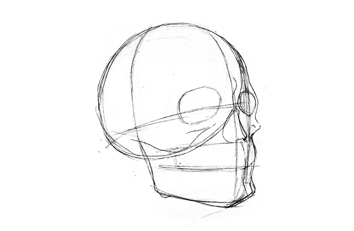 Practice drawing skulls from other views, like a true front view or side view, to get fully acquainted with the anatomy. When drawing a full profile of a skull, it can be important to remember that the spine doesn’t end at the bottom of the jaw; it goes up to the bottom of the back of the skull. “Everything connects to that little spot at the base of the skull,” says Elliott. “If you run your finger up the back of your neck, you can feel where it all connects.”