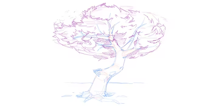 Start out with a few leading lines to indicate the general shape and guide the direction of the tree branches. For this tree, Nugent chose to start with a graphite pencil in Adobe Fresco for a pencil drawing style. Pen and ink will also work well with this method, but you may want to save the watercolours or coloured pencils for later in the process.