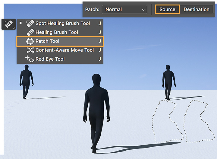 Isak wanted to add mystery to this photo by removing the footprints. To do this, he drew around a set of footprints with the Patch Tool—making sure Source was selected in the Options bar. He then moved that selection to an area where he could sample replacement sand and repeated this step until all footprints were gone.