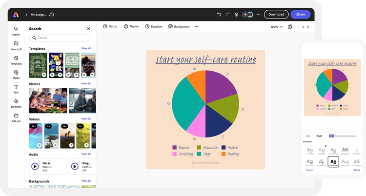 Add your own photos or videos and start your creation from there. You can also import your PSD or Ai files and Adobe Express will recognize all of your layers.