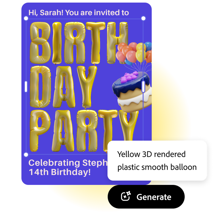 Use the Generate text effects tool available in the full Adobe Express editor to make your birthday invitation title look like it’s made of candles or add a balloon texture by simply typing in a description of what you want to see in the prompt box. Watch as your idea comes to life in a matter of moments. It’s a piece of cake.