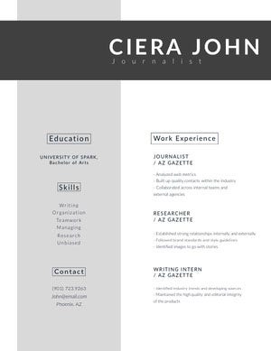 As a journalist, you know all about how to hook a reader. Let your resume be telling of your writing skills and style. Then, get creative with your design. Use color, typography, and layout to break up your resume sections and create a hierarchy. If you have a specific beat, use your resume’s design to cater to that to show your readers you’re the expert in your field.