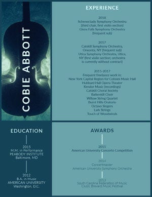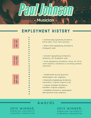 As a musician, there’s likely a lot for you to include, for example, performance experience, principal teachers, professional training, and probably quite a few other categories. Pick the essential details that paint the best picture of who you are today and what you have to offer. For the design, think about wherever you fit in with the music world, and then let your resume showcase that. Use imagery, colors, and typography to reflect your music style or training. And, don’t forget to include links to your social channels, website, or portfolio.