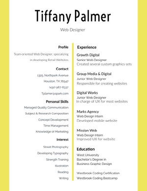 As a web designer, you probably have a lot to feature on your resume. Use design to help break up all your information and create a clean and enticing visual hierarchy—hook readers with a header objective that will lead them through the rest of your resume. Save space by getting creative – for example, rather than list out the programs you work with, consider using icons, logos, or progress bars.