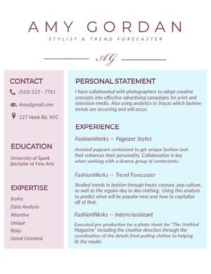 Fashion moves fast, so you’ll want to create a resume that will capture the attention of your reader from the first glance. Use a bold design that resonates with your style. Then, be straight to the point with your vocabulary. Use direct terms to describe your skills and experience, and omit any extra details that don’t pertain directly to the type of position you’re applying to.