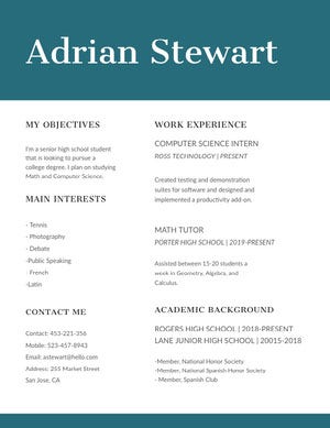 As a high schooler, chances are you won’t have a ton of employment history to feature on your resume, but that’s okay. Use your resume to highlight your accomplishments, relevant curriculum, extracurriculars, skills and interests, and anything else that makes you proud. You can certainly get creative with your design, as well. Create a resume that matches your aesthetic, or use your school’s colors and logos to brand your resume.