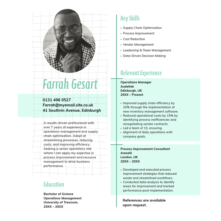 - Consider a subtle colour palette: While it’s important to remain professional, adding subtle colours (such as navy or grey) to your headers or borders can make your CV more visually engaging without being distracting.