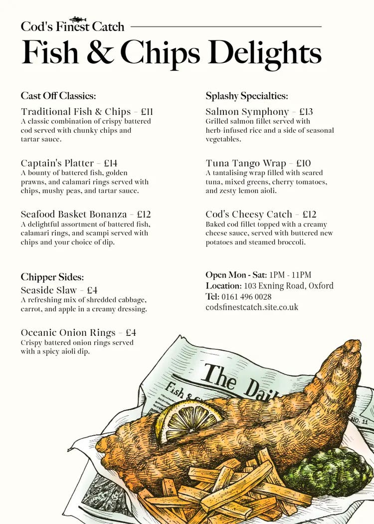 If you’re planning to introduce a fish and chip night to your restaurant or want to refresh your chip shop offerings, creating a new menu or flyer is a great place to start.