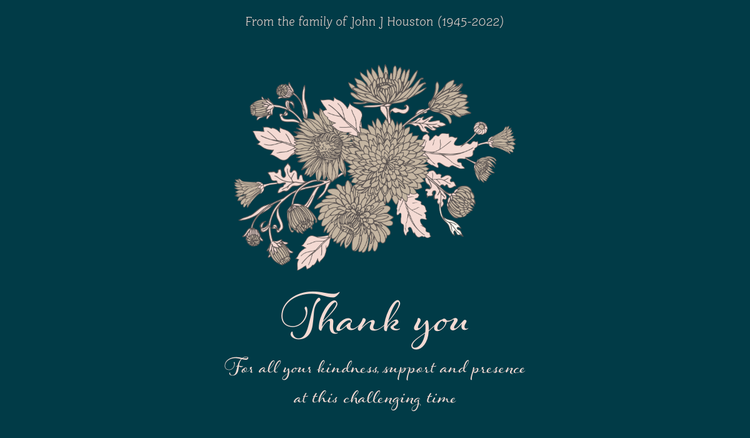 To make saying thank you for attending the funeral easier, Adobe Express has a wide range of templates that you can use to send thank you messages. There are a range of styles to choose from, so you can select a theme that suits your loved one and their personality.