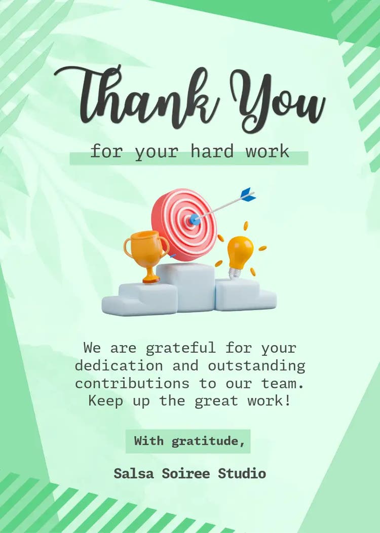 "Your dedication and hard work are truly inspiring. Thank you for being such a valuable team member."