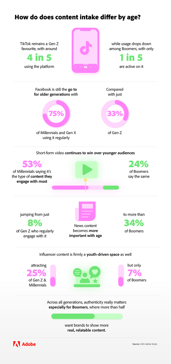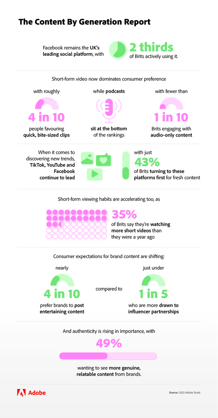The Content by Generation Report is the result of a comprehensive national survey conducted by 3 Gem on behalf of Adobe Express. The survey polled 2,000 UK adults between 5/11/2025 – 12/11/2025.