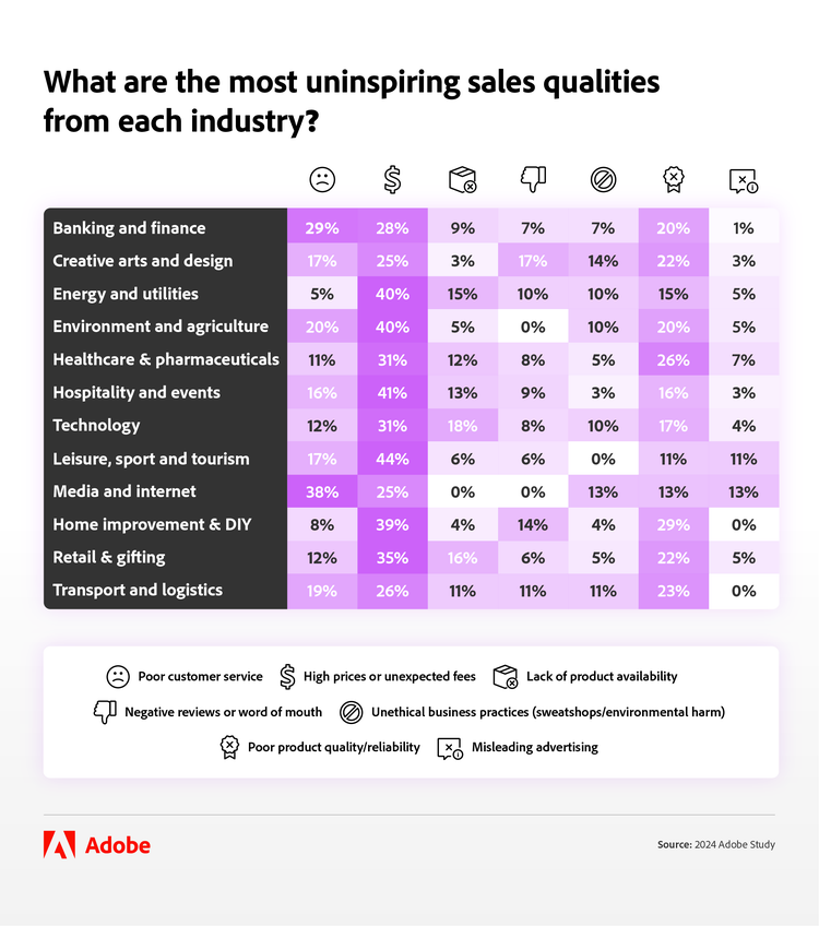 In the energy and utilities industry, 40% mentioned high prices, as well as 41% in the hospitality and events sector. In the creative arts and design industry, 25% highlighted high prices and unexpected fees, with 22% revealing they may be discouraged by poor product quality.